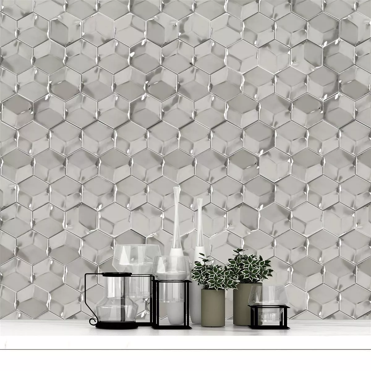 A fényes ezüst színű Contender Hexagon modern mozaik csempe jó választás minden extravagánsan berendezett helyiségbe. A tetszetős fali csempék kiváló minőségű szálcsiszolt rozsdamentes acélból készülnek, így hosszú éveken át örvendeztetnek egyedi megjelenésükkel. A robusztus fali csempe 3D-s mozaikként készült. Ezért amikor fény éri, sok gyönyörű hatás érhető el, nem csak a fényes felület miatt. A 3D optika különleges fényvisszaverődést is biztosít, amely különösen lenyűgöző módon töri meg a nappali fényt és a helyiségben lévő mesterséges fényt.