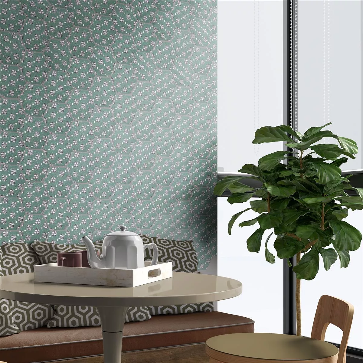 A „Modena Hexagon Decor 7” porcelán kőcserép a lenyűgöző dizájnt és a magas funkcionalitást ötvözi. 10 mm vastagságukkal tökéletesek nedves helyiségekbe, zuhanyzókba, fürdőszobákba, konyhákba, nappalikba és beltéri helyiségekbe. A matt felület vonzó zöld színben, virágdíszekkel, időtlenül elegáns megjelenést kölcsönöz a csempének.